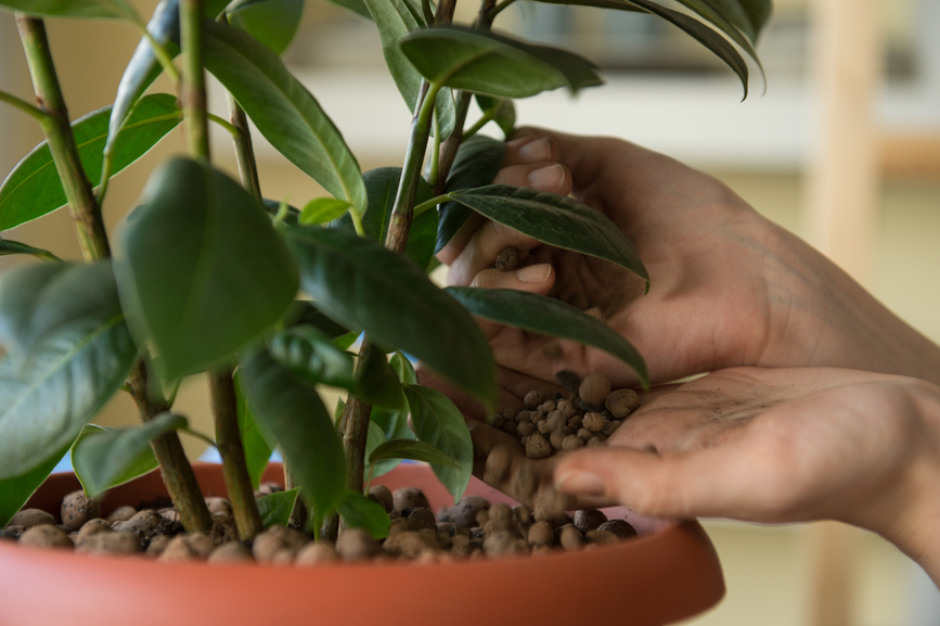 Houseplants can become bound by the containers they are in. Most plants outgrow their pot within one to two years, so it’s important to swap it out for a larger one with fresh soil, or replant it in the ground outside, giving it more space to grow. You’ll know when to repot because the leaves may turn yellow, indicating it isn’t getting enough nutrients from the soil anymore or water may pour quickly out the bottom holes as you water it. In some cases, you may see roots growing out of the drain holes in the plastic grower pot.