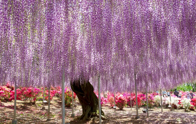 The Japanese love flowers, and wisteria are among their favorites. One of the best places to view fuji flowers is the Ashikaga Flower Park in Ashikaga City, Tochigi Prefecture. Ashikaga Flower Park features lots of blue, white and pink fuji, as well as yellow laburnum (Japanese: kingusari) that look like yellow colored fuji.